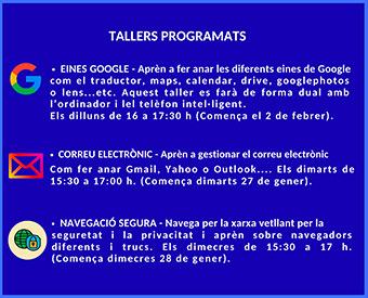 - Eines Google: aprendre a fer anar les diferents eines de Google com el traductors, maps, calendar, drive, googlephotos o lens, etc. Aquest taller es farà de forma dual amb l’ordinador i el telèfon intel·ligent. Els dilluns de 16 a 17.30h (Comença el 2 de febrer).